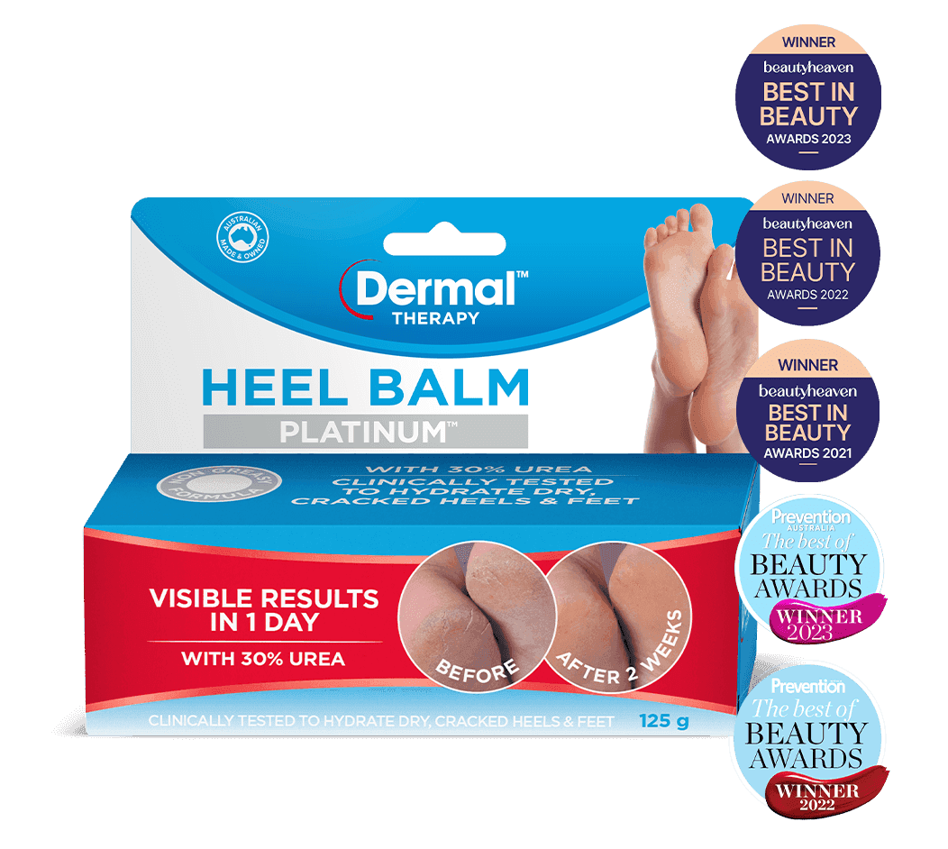 Give your heels a chance, with Dermal Therapy Heel Balm Platinum, designed to optimise the treatment of extreme heel dryness and restore skin properties.