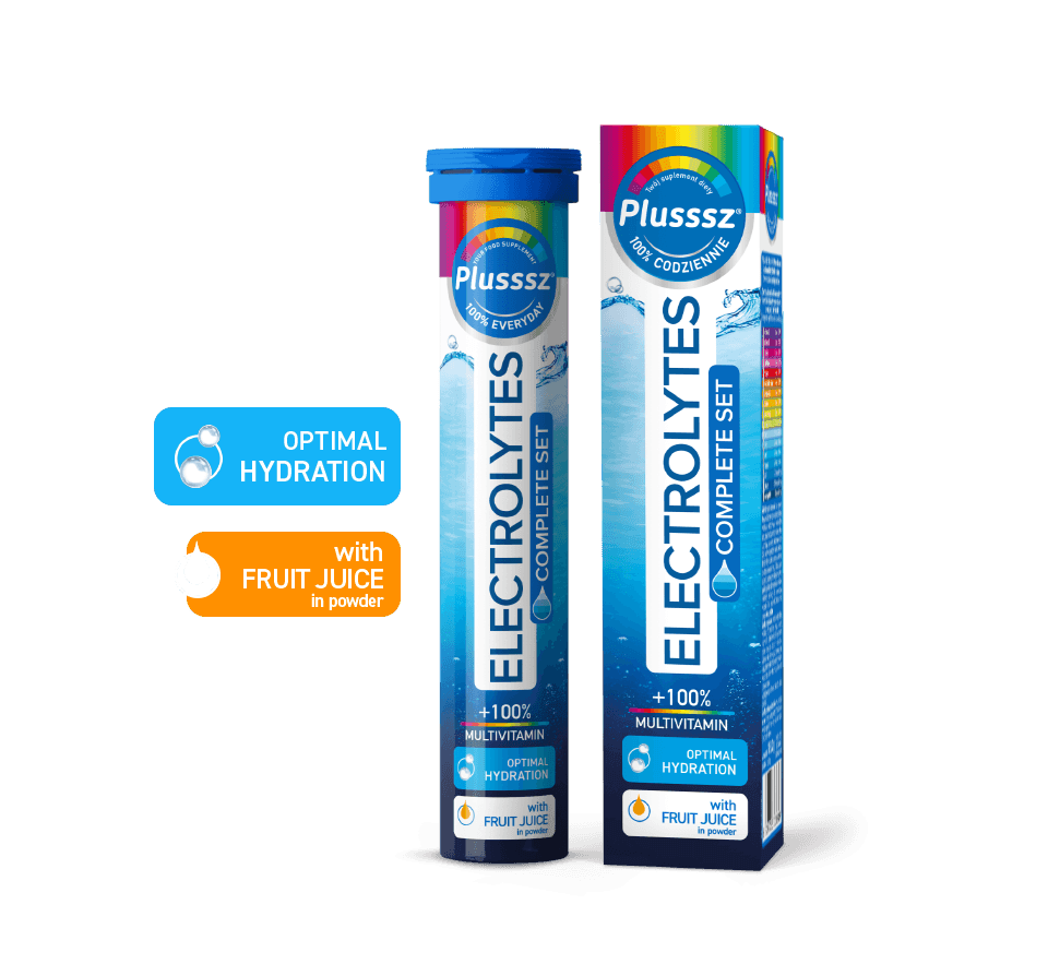 Plusssz Electrolytes + 100% Multivitamin contains 100% electro complex - a special set and concentration of all the most important electrolytes (sodium, potassium, magnesium, calcium and chlorine), glucose and a complex of the 10 most important vitamins in amounts providing 100% of the daily Reference Intake Values for adults. Recommended during hot weather, travel, sports activity, mental effort, physical work, after excessive alcohol consumption and fatigue. It quenches thirst and hydras the body. Take care of fluid replenishment!